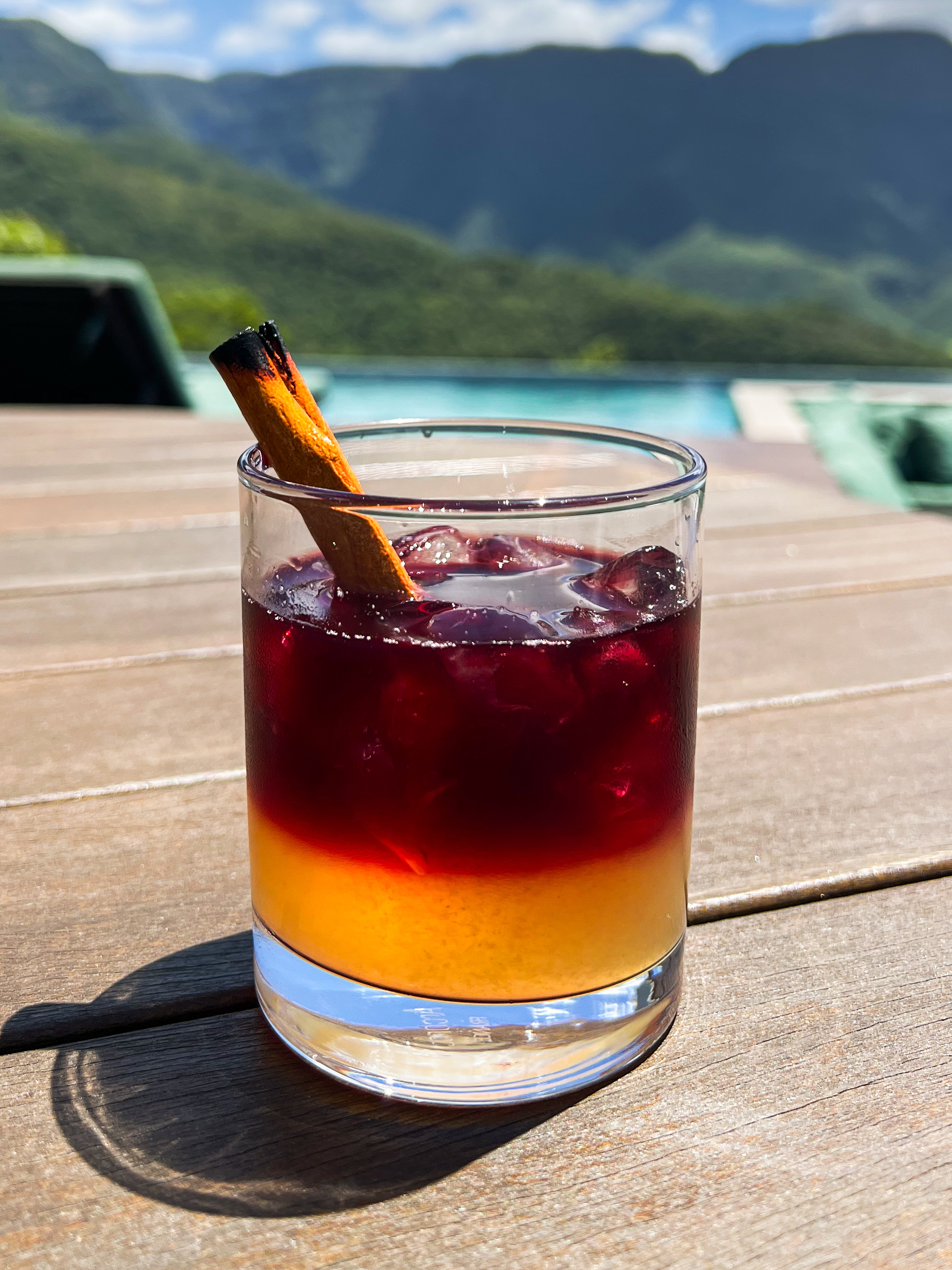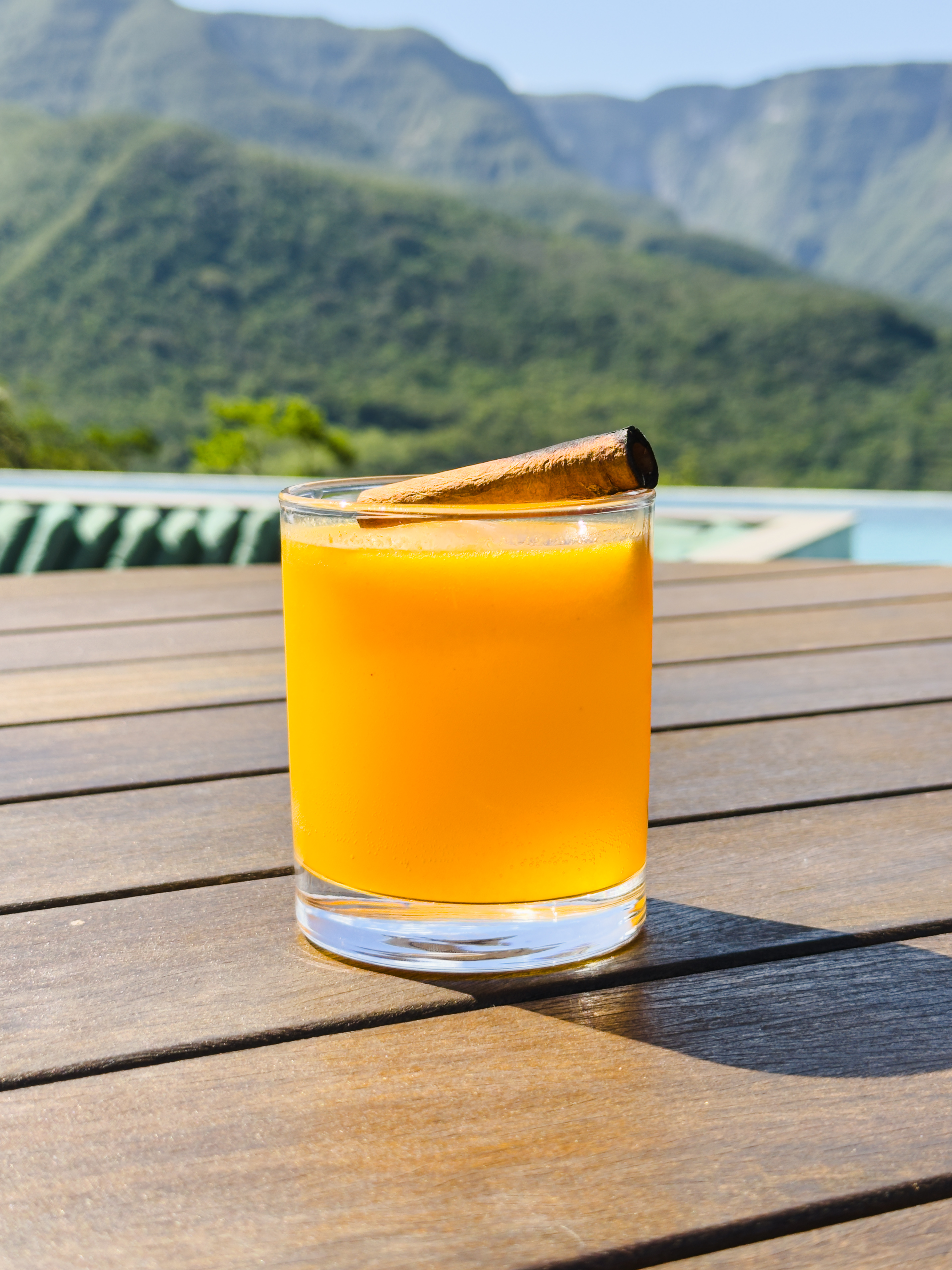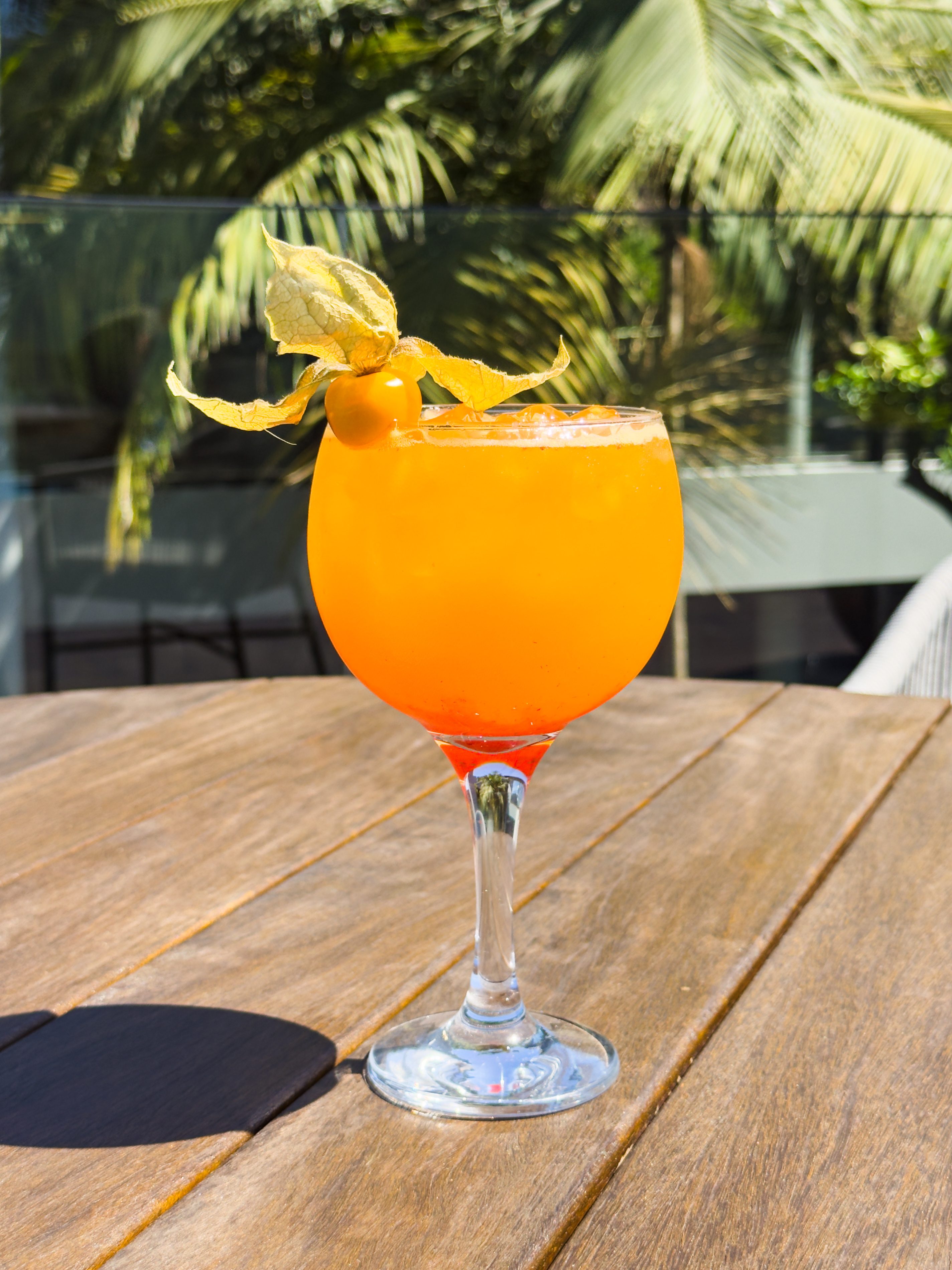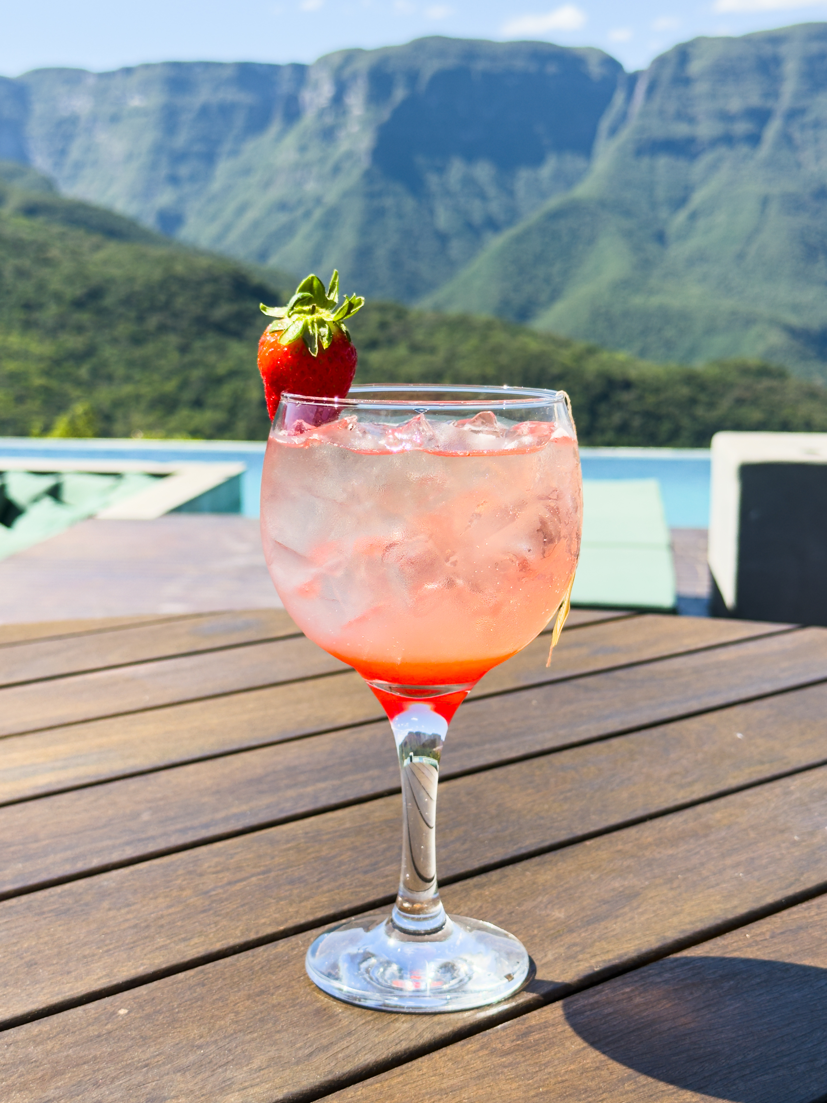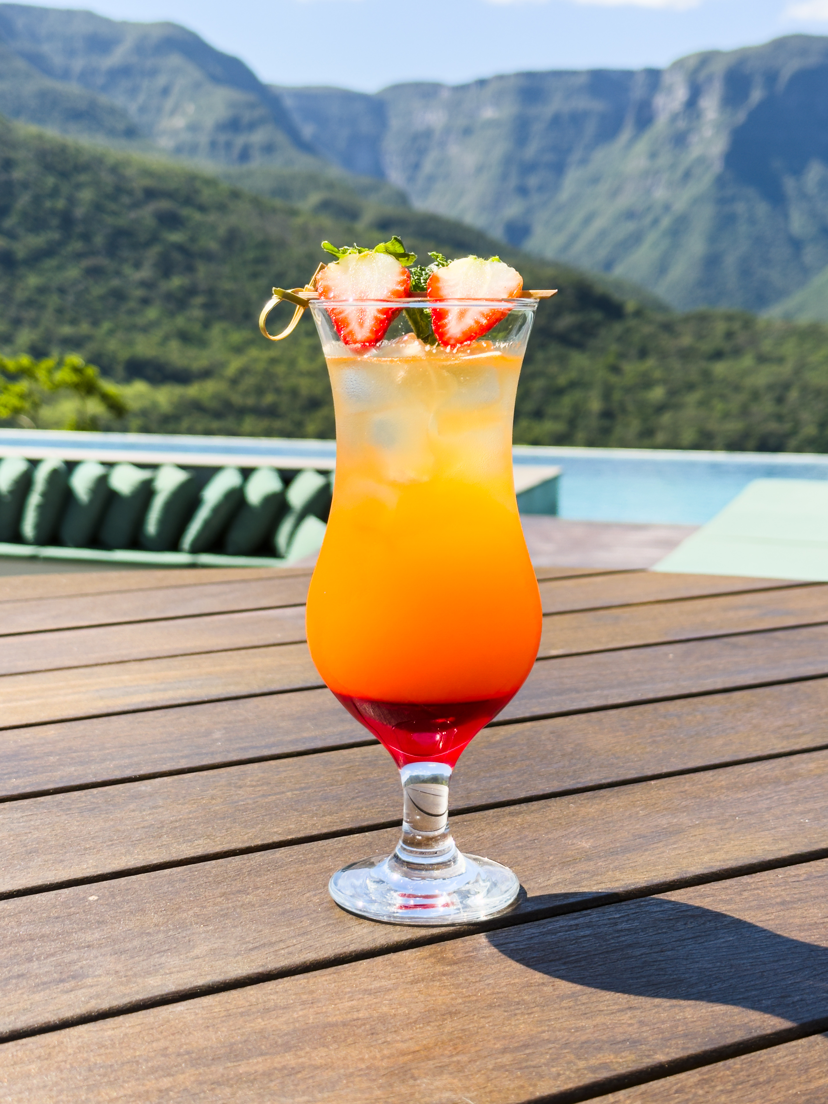 Suco de laranja, energético tropical, xarope de morango e gin.