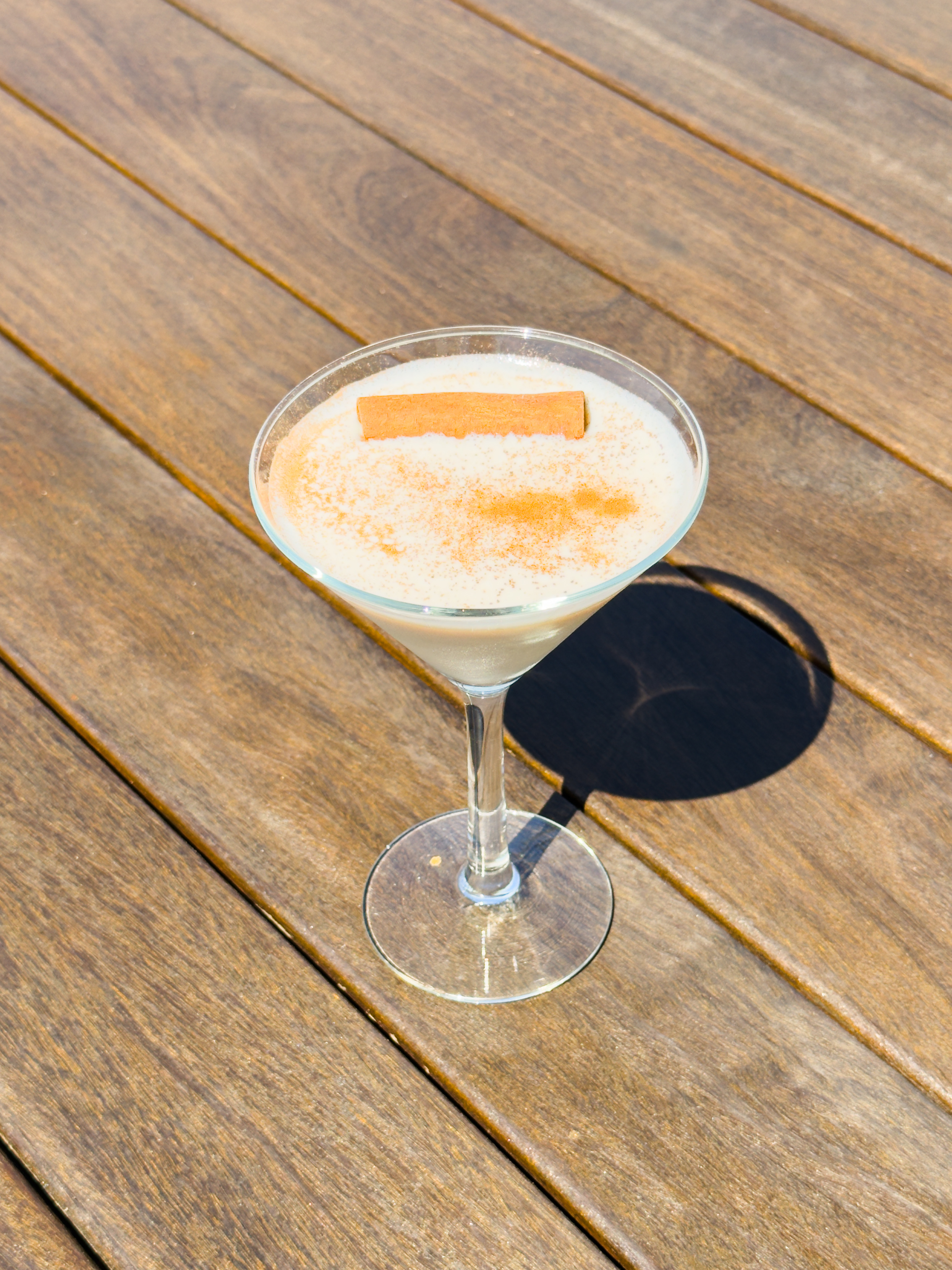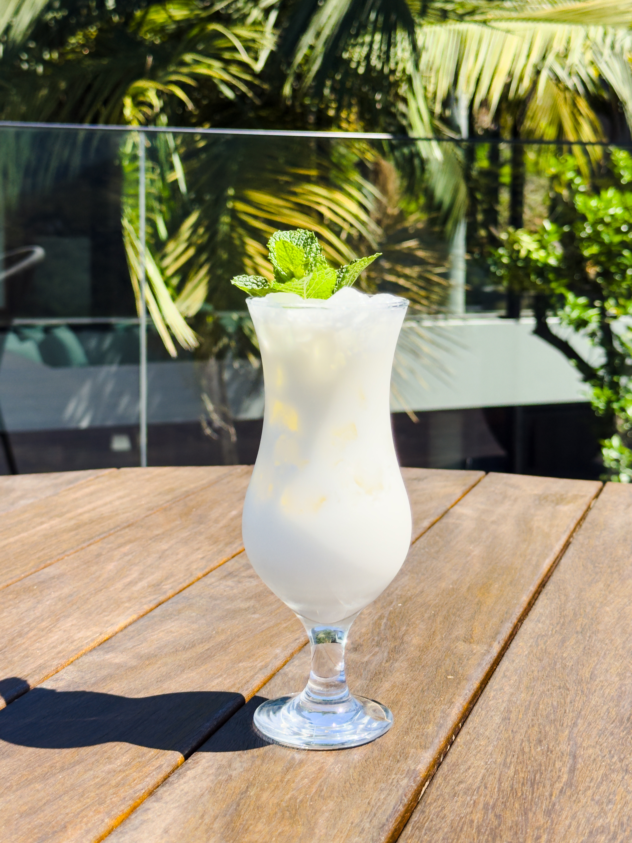 Leite de coco, leite condensado, suco de abacaxi e rum.