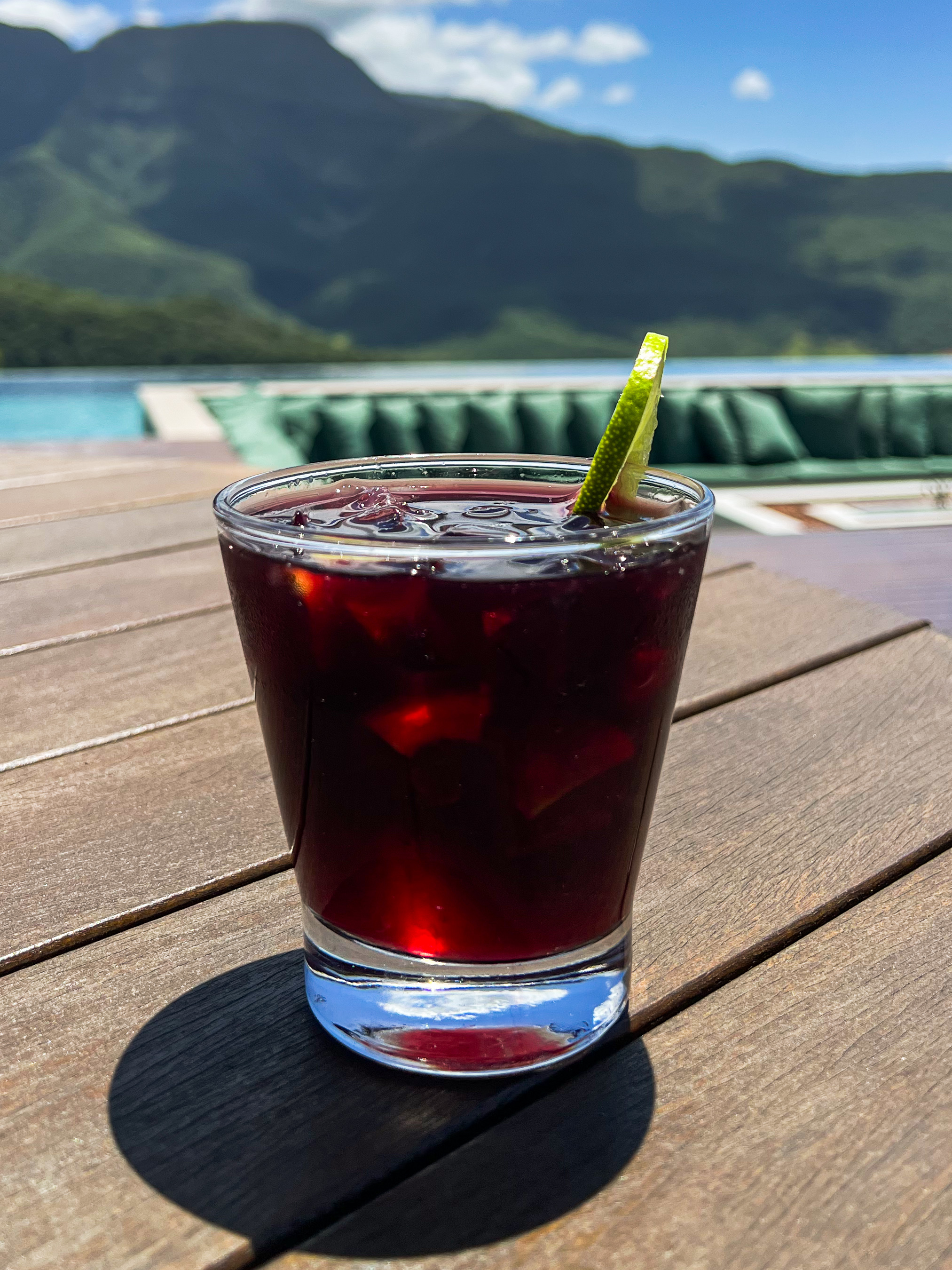 Frutas vermelhas/morango/limão, hortelã, agua com gás, rum e xarope de açúcar.